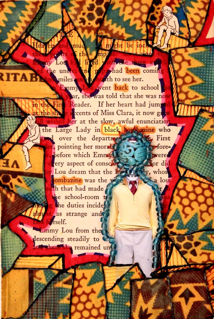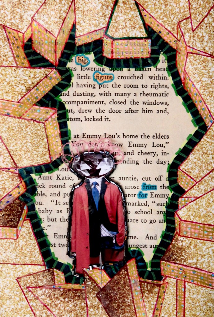 “A Solemn Looking Gentleman” Acrylic, marker, paper, glue, beads and thread on vintage paper (1902) 7.25″ x 5″ 7.25″ x 5″