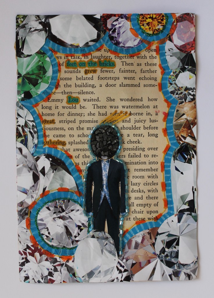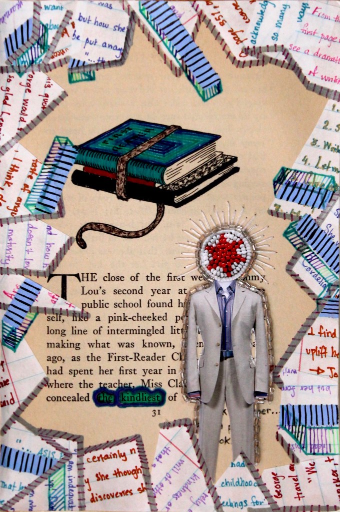 “The Kindliest of Men” Acrylic, marker, paper, glue, beads and thread on vintage paper (1902) 7.25″ x 5″