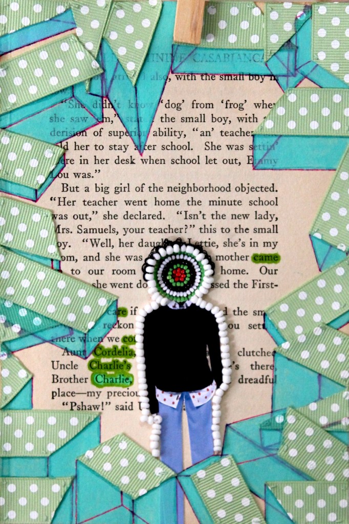 “Charlie” Acrylic, ribbon, marker, paper, glue, beads and thread on vintage paper (1902) 7.25″ x 5″