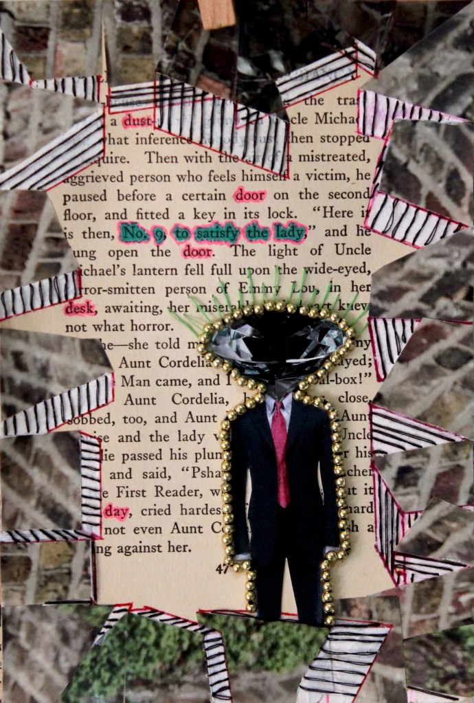 “No. 9 to Satisfy the Ladies” Acrylic, marker, paper, glue, beads and thread on vintage paper (1902) 7.25″ x 5″