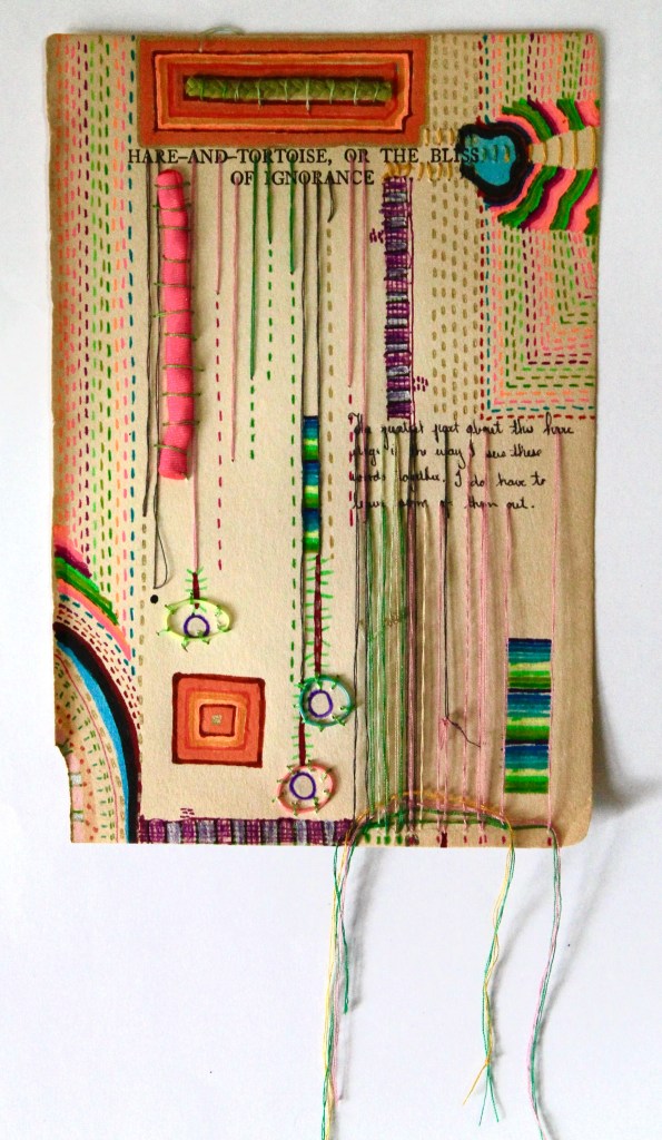 “Footprints in the Woods” (2012) Marker, string, fabric, paper and acrylic on vintage paper (1902) 7.25″ x 5″