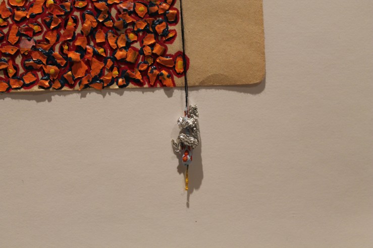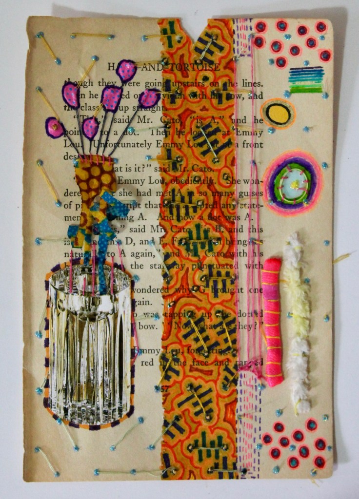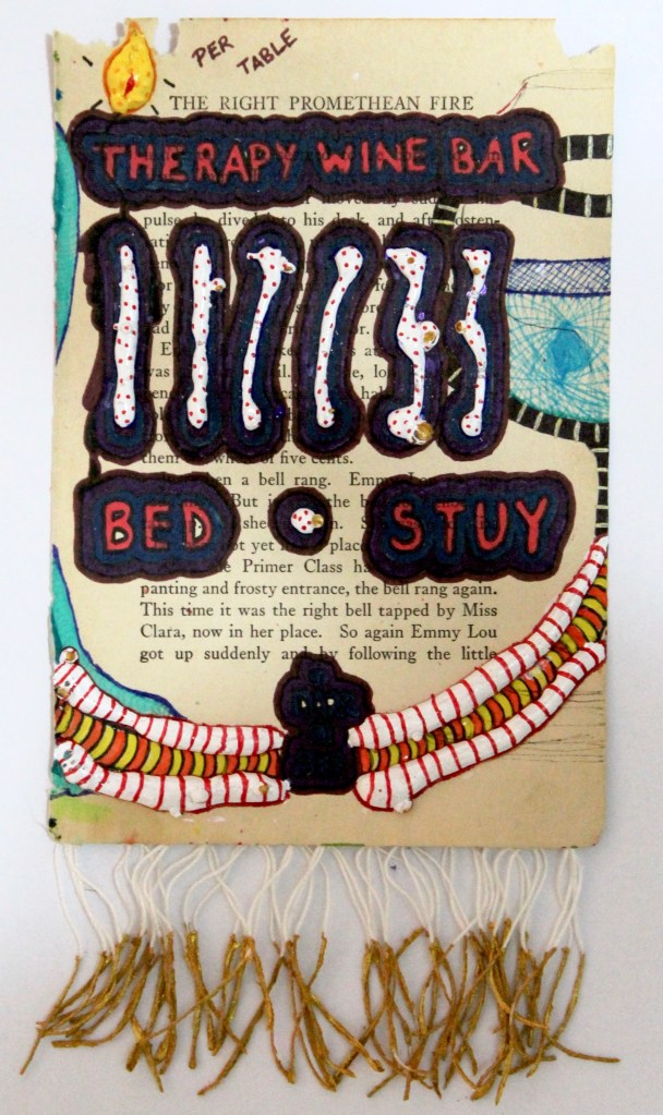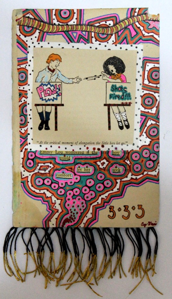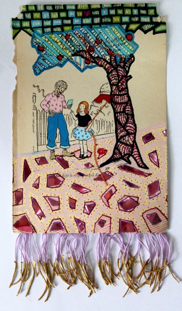 “Forgot Valentine’s Day” (2012) Permanent marker, gorilla glue, string, paper, fabric and acrylic on vintage paper (1902) 7.25″ x 5″