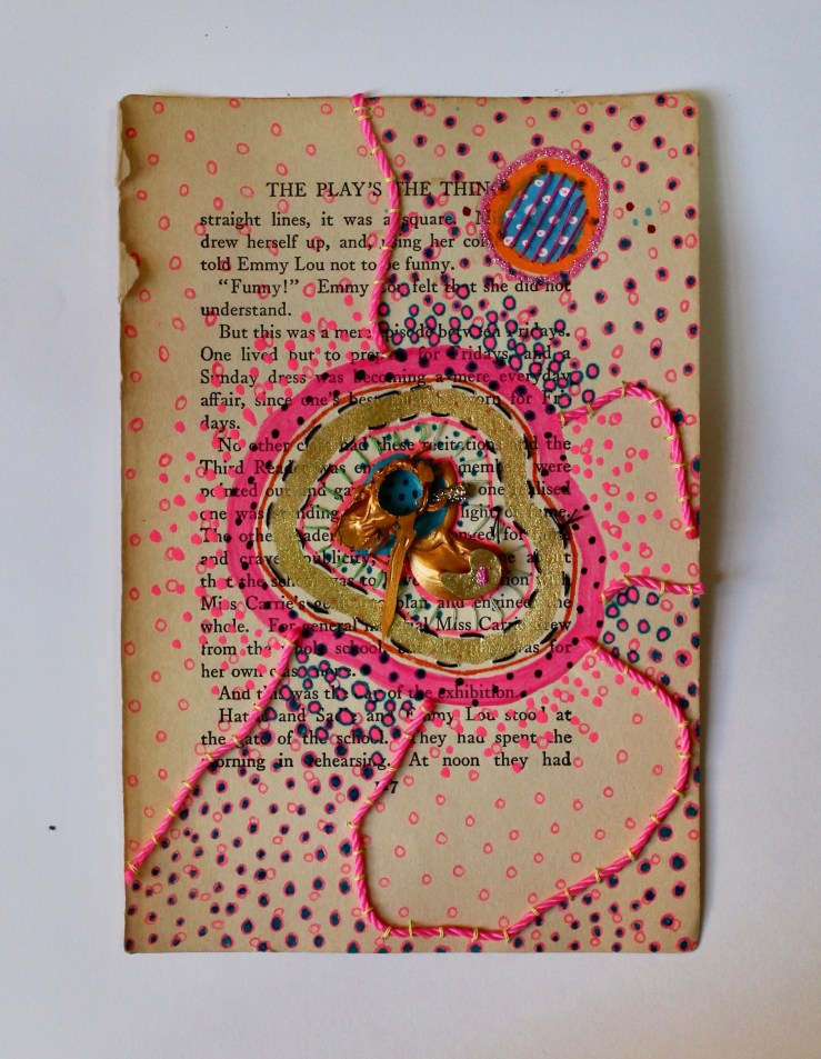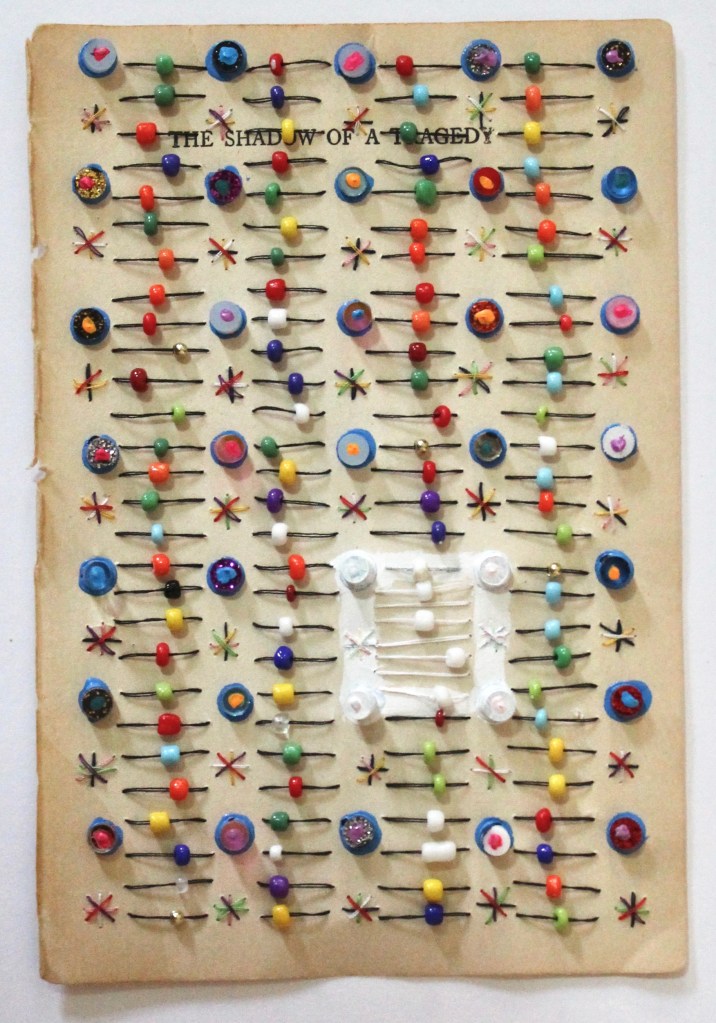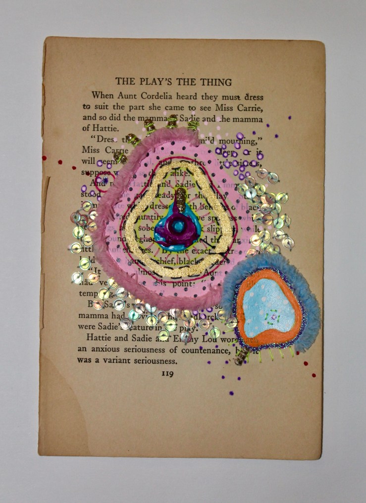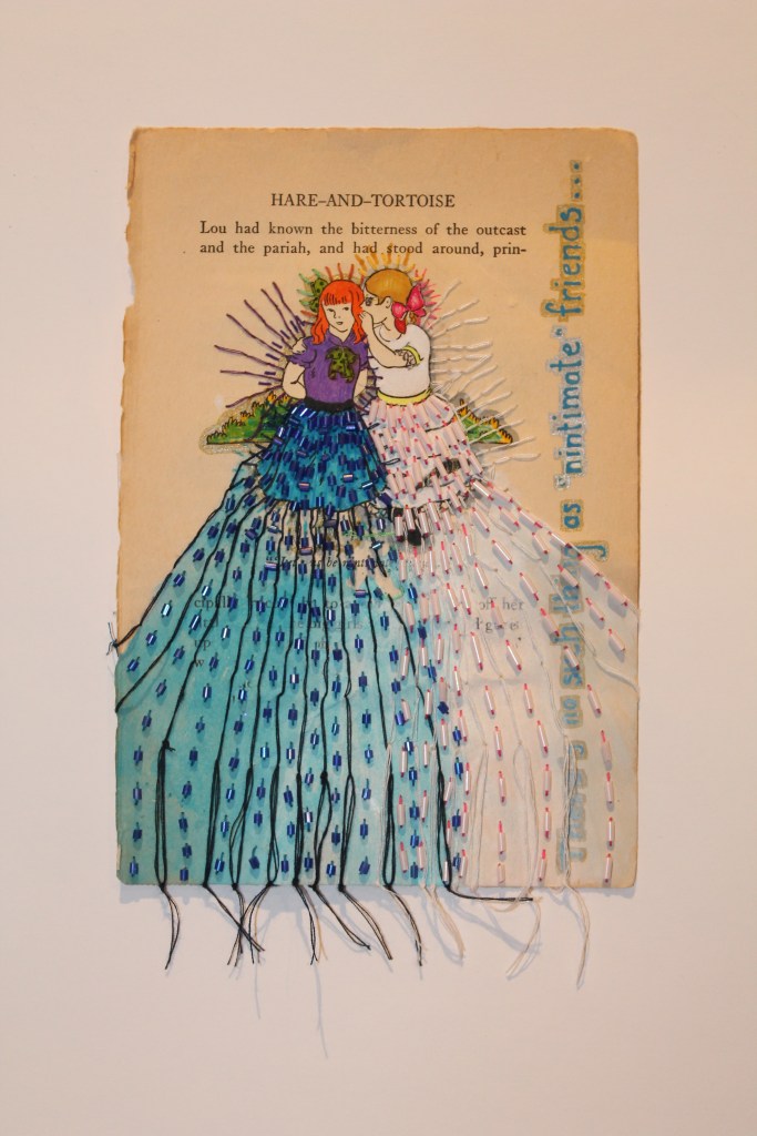 “Little Peacocks” (2015) Marker, beads, acrylic and string on vintage paper (1902) 7.25″ x 5″