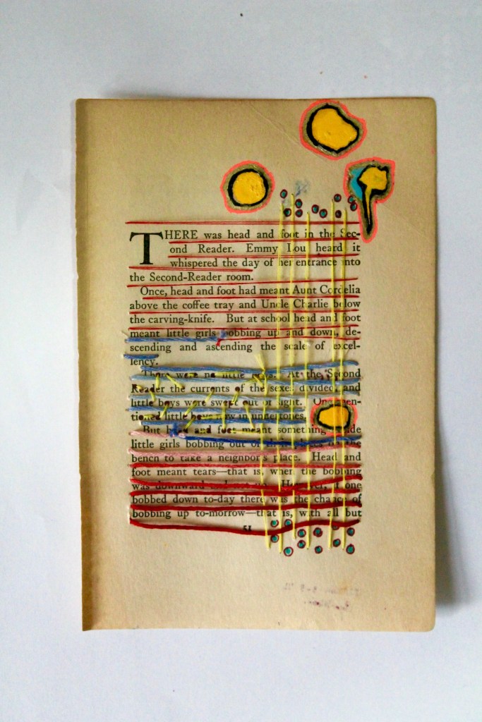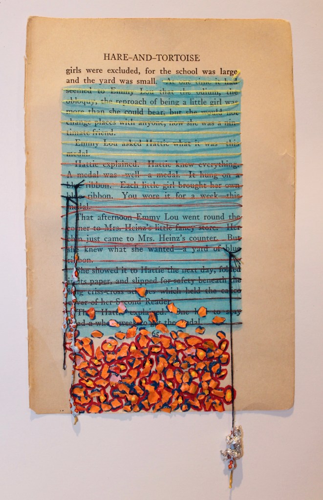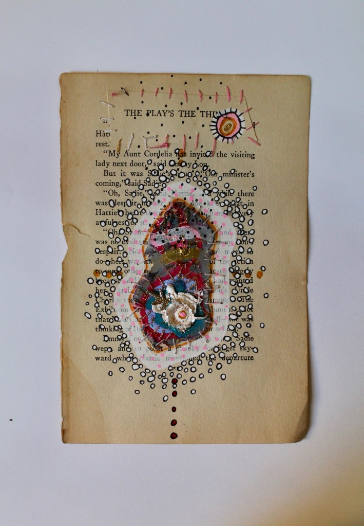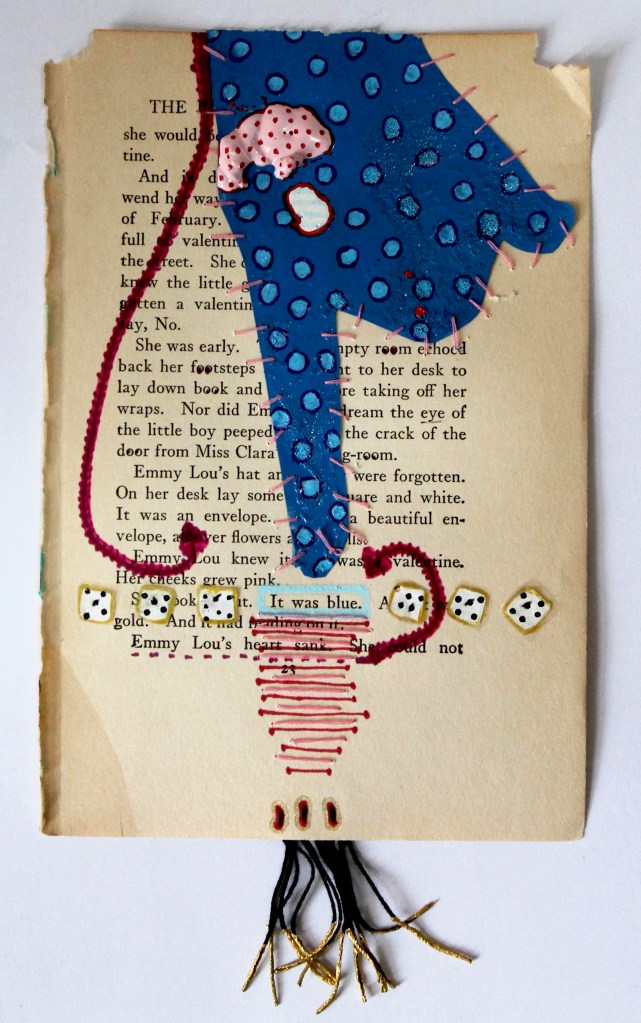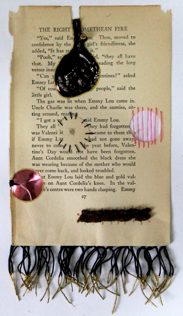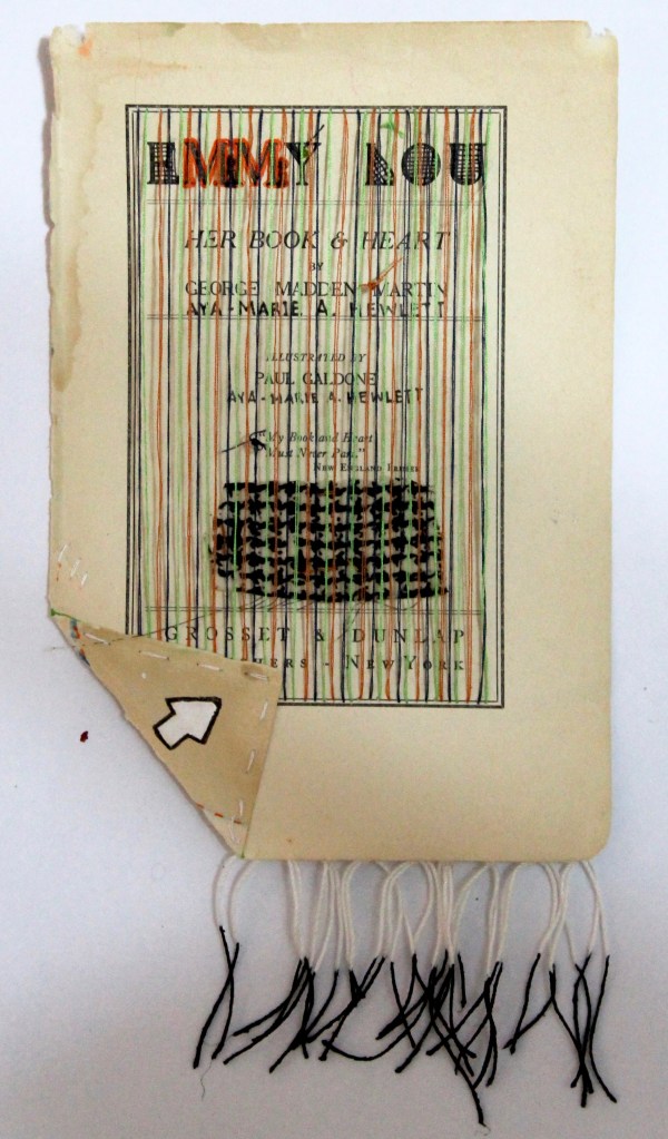 “Her Book and Heart (Pull Here)” (2012) Marker, string, fabric and acrylic on vintage paper (1902)