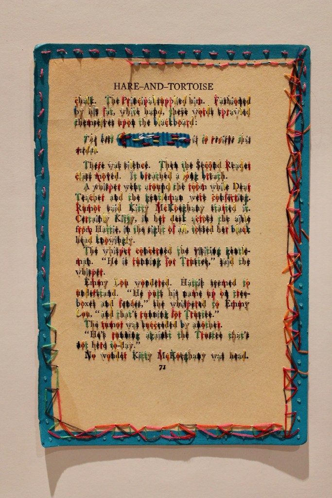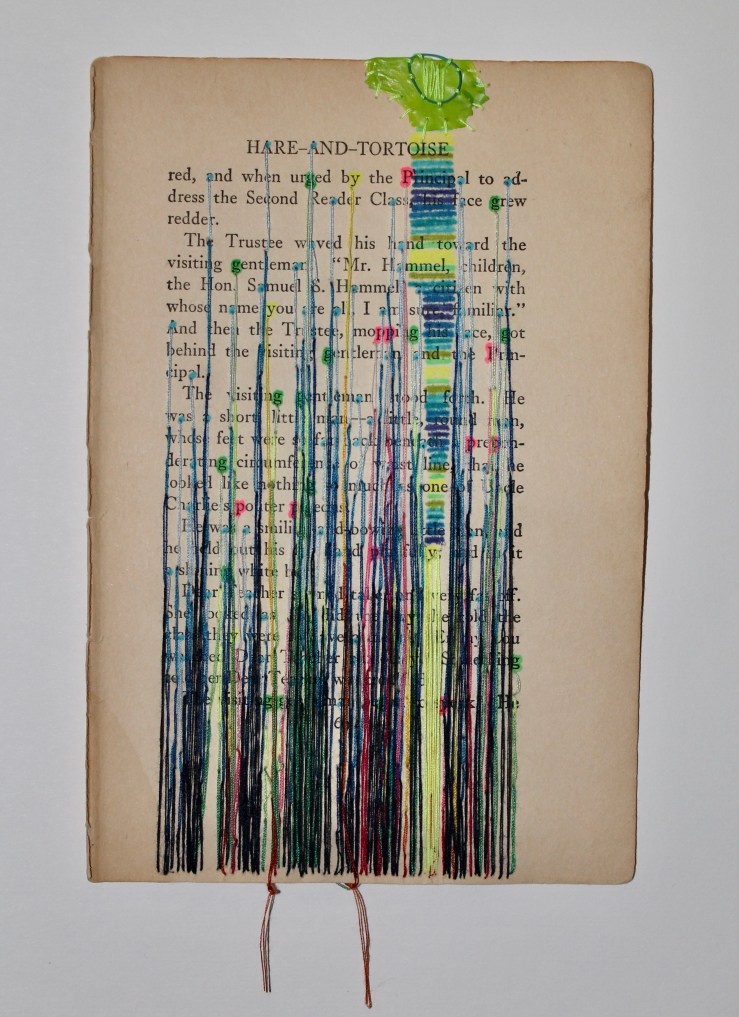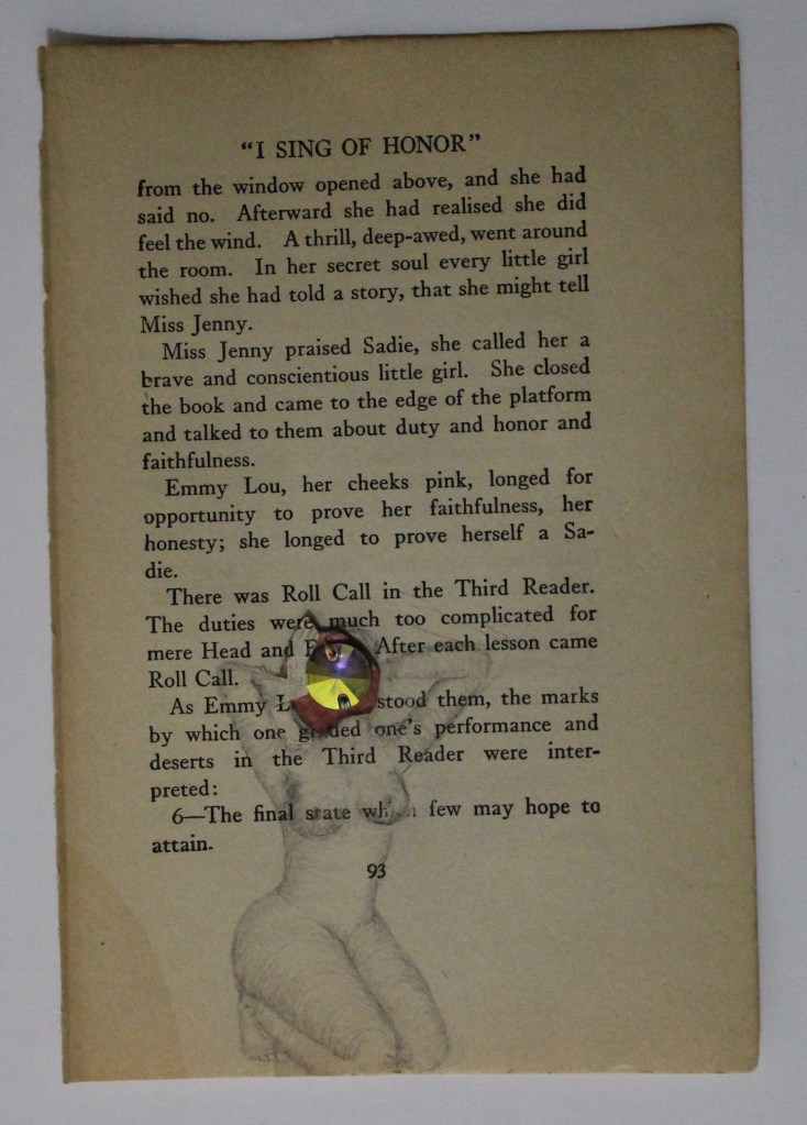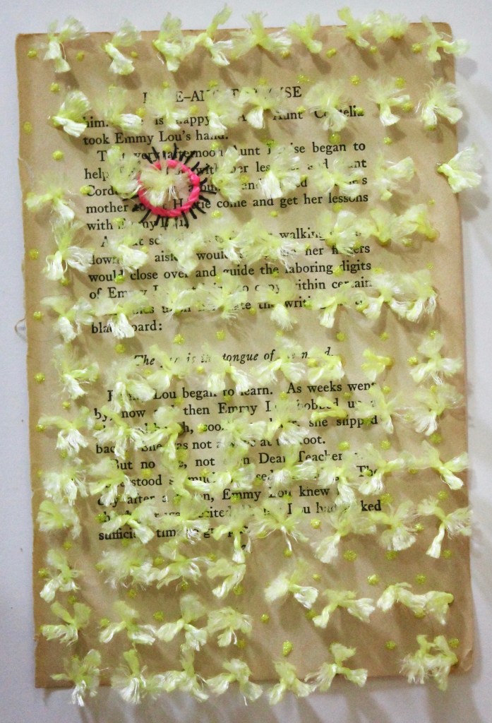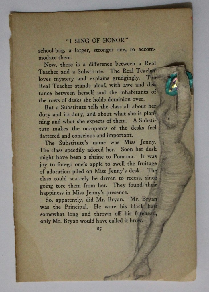 “Her Book and Heart (Pull Here)” (2012) Marker, string, fabric and acrylic on vintage paper (1902)