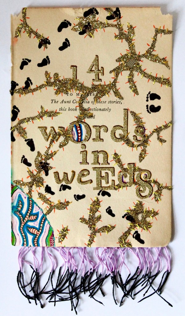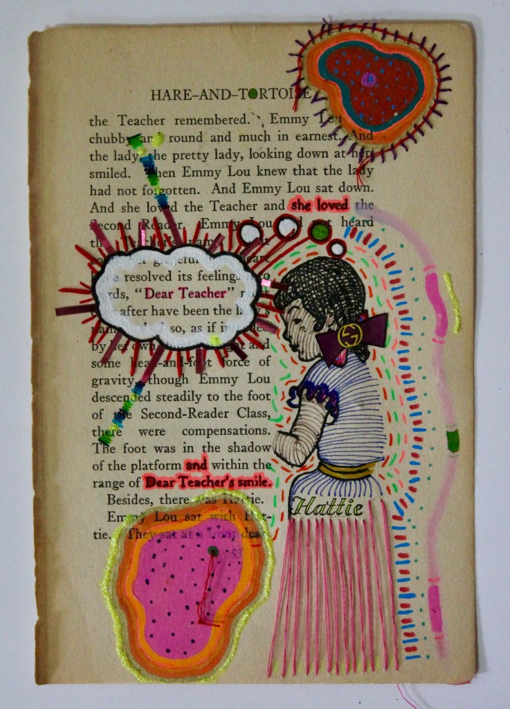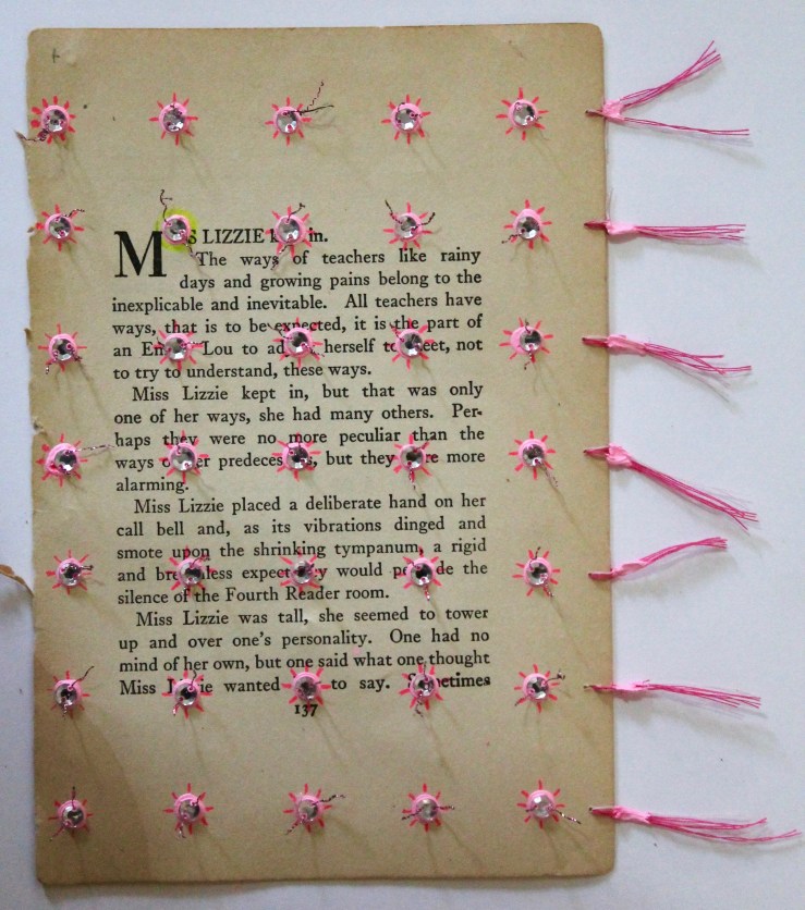 “Dear Teacher’s Smile” (2015) Marker, beads, acrylic, glitter and string on vintage paper (1902) 7.25″ x 5″