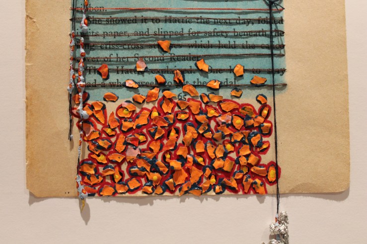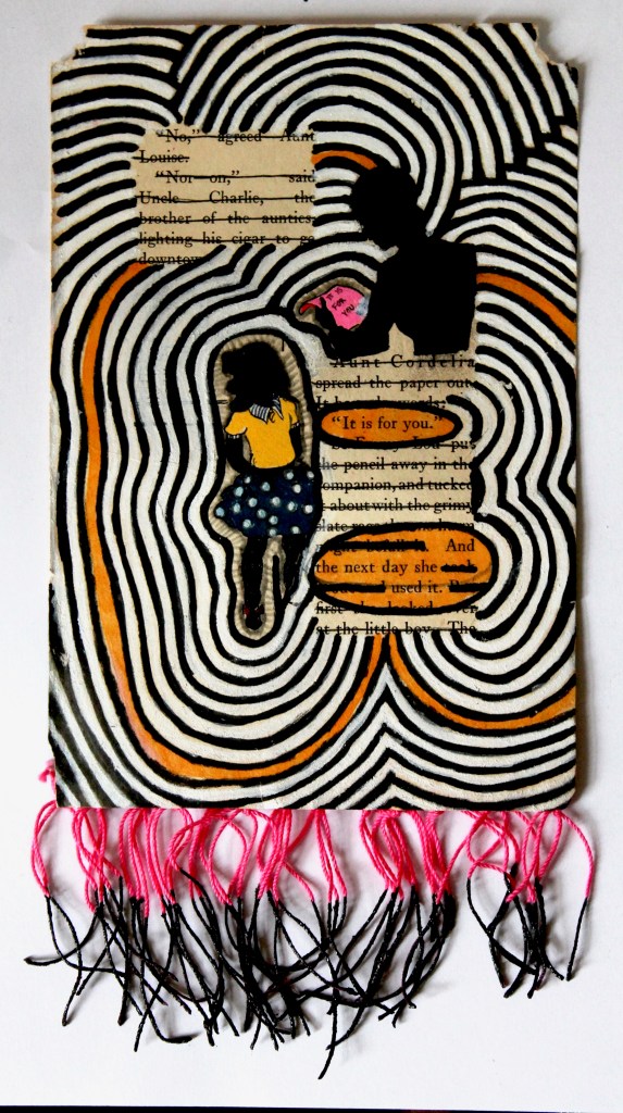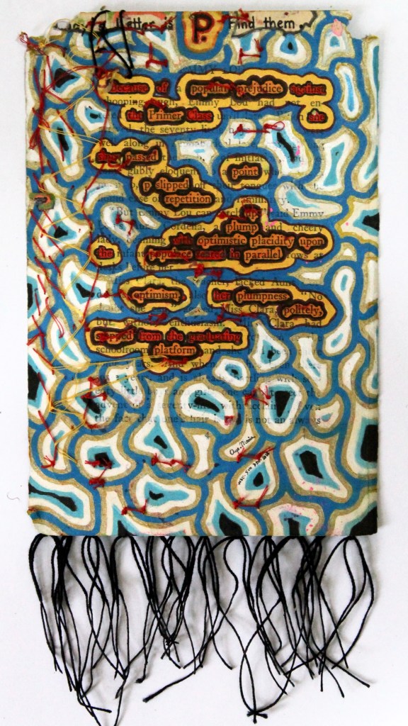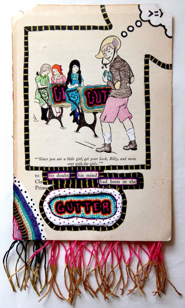 “Exploring The Gutter” Paper, marker, gorilla glue, thread and acrylic on vintage paper (1902) 7.25″ x 5″