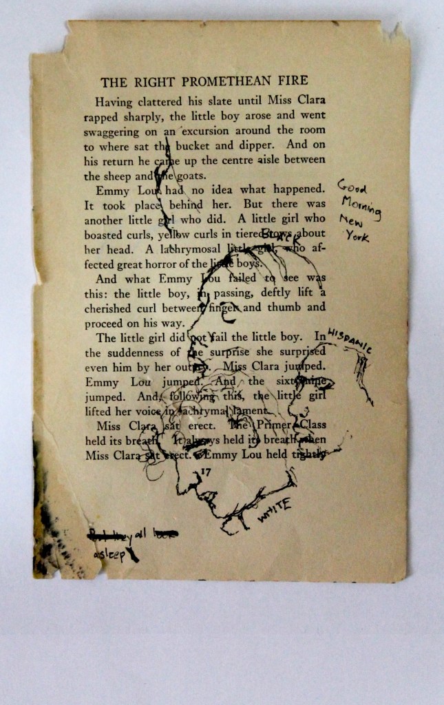 “Holes In The Story” (2015) Oil marker, maker and string on vintage paper (1902) 7.25″ x 5″