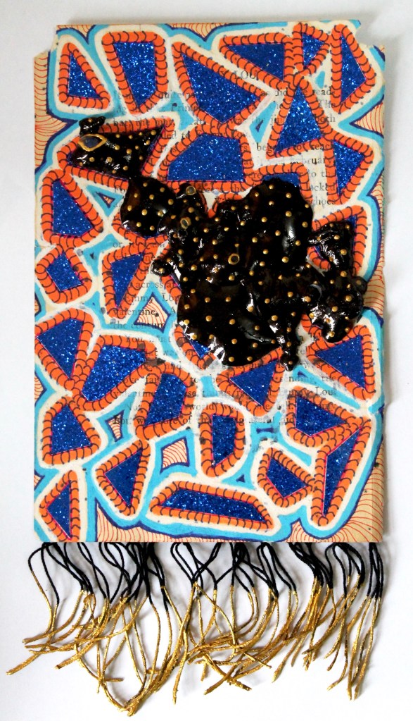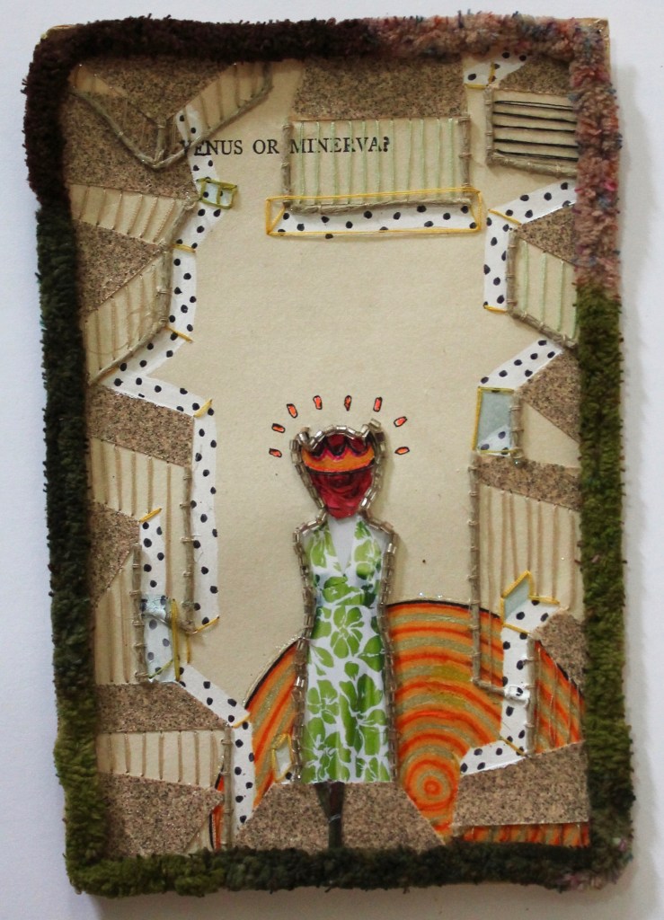 “Venus” Paper, sand paper, beads, glitter, pen, string, fabric, acrylic and marker on vintage paper (1902) 7.25″ x 5″