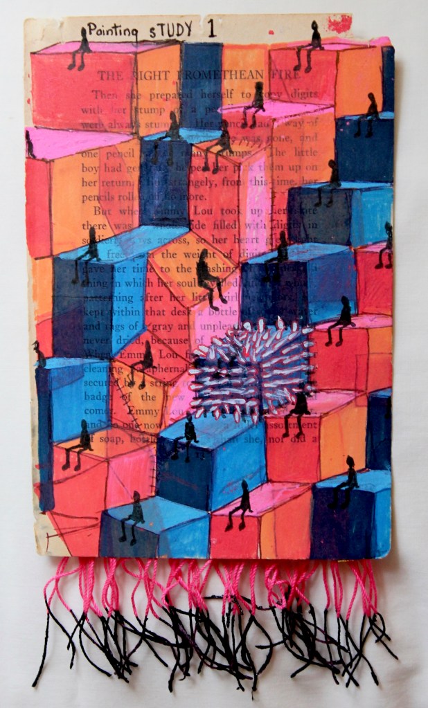 “The Cube (Painting Study 1)” Oil markers, thread, acrylic and marker on vintage paper (1902) 7.25″ x 5″