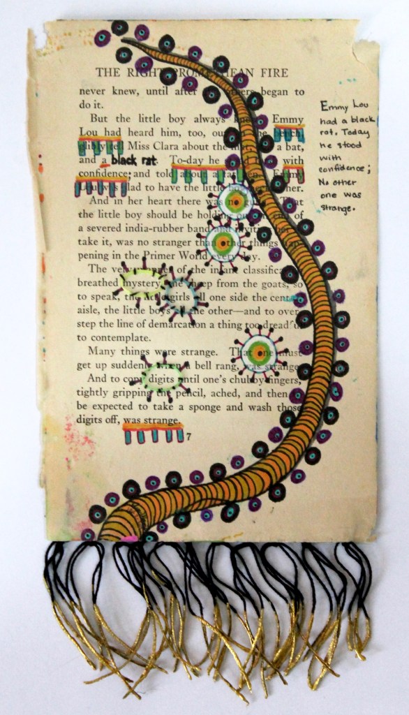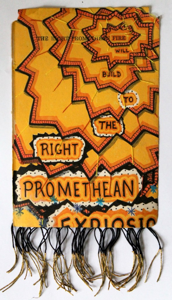 “The Right Promethean Fire” (2012) Marker, pen, thread and acrylic on vintage paper (1902) 7.25″ x 5″