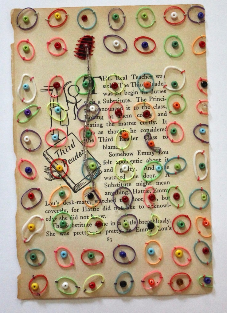 “The Rubber Band Page” Beads, acrylic, string and rubber bands on vintage paper (1902) 7.25″ x 5″