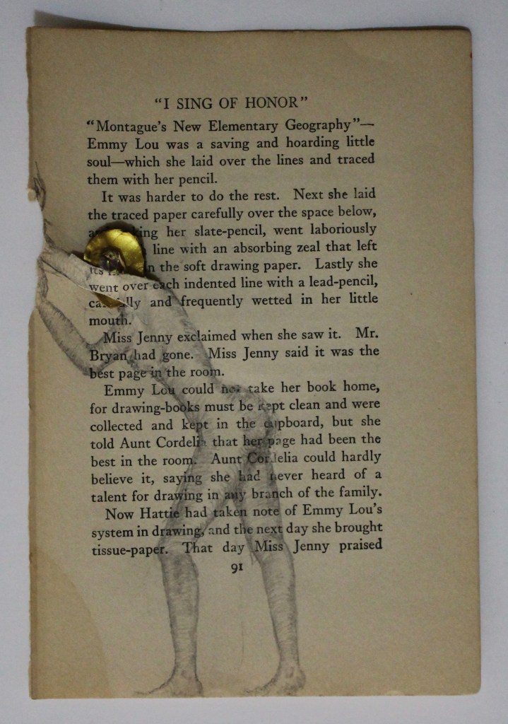 “Girls Were Excluded, But She Wanted To Play” (2012) Acrylic, foil and string on vintage paper (1902) 7.25″ x 5″