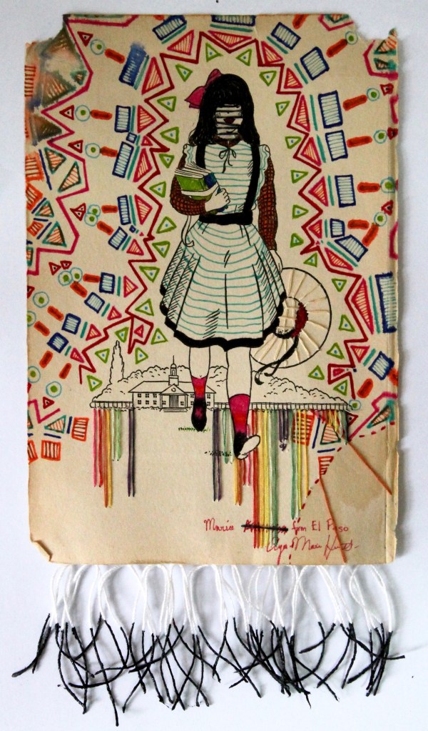 “Maria From El Paso” (2012) Marker, string and acrylic on vintage paper (1902) 7.25″ x 5″