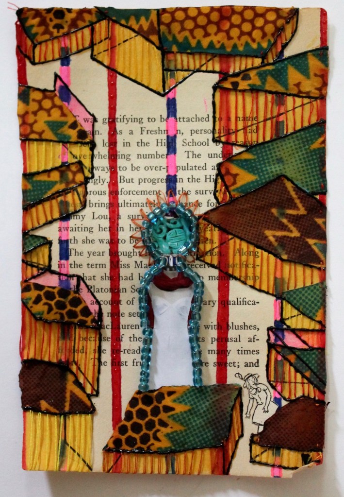 “Peek-A-Boo” Paper, fabric, beads, string, acrylic and marker on vintage paper (1902) 7.25″ x 5″
